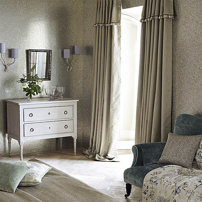 Rialto a été conçu dans le studio Zoffany par Peter Gomez. Ce motif avait été donné en tant que projet au gagnant du « Zoffany Wallpaper Award » au fameux concours des étudiants du CAMAC, et il a été réalisé de fort belle manière. Les motifs ont été créés en utilisant des flocons de feuilles d’or sur un fond coloré et ont été imprimés avec des couches d’encre d’or en surimpression afin de recréer l’éclat des motifs d’origine.