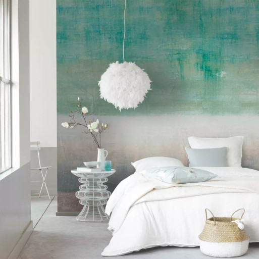 Le panoramique Paint Wall de Casadéco, issu de la collection Beauty Full Image, affiche un subtil dégradé de verts et de gris. Son design épuré instaure une atmosphère à la fois moderne et apaisante.