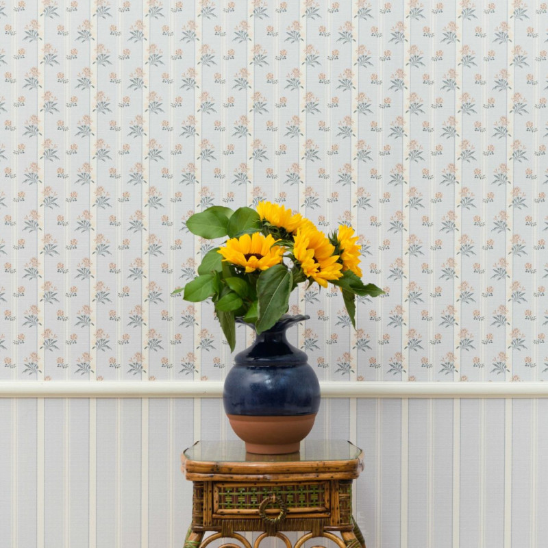 Le papier peint Rayure Mademoiselle de la collection Belle Époque de Quenin - Lelièvre revisite une rayure élégante avec un effet ottoman, inspirée du tissu Les Bleuets (4054). Imprimé sur papier intissé de qualité, il apporte une touche raffinée et intemporelle aux intérieurs.