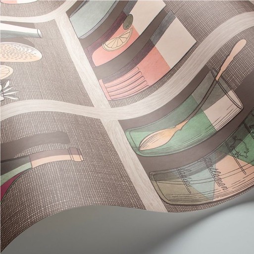 Le papier peint Cocktail de la collection Fornasetti Senza Tempo de Cole & Son, inspiré d'un design d seau à glace intitulé 'Oggetti Cocktail' conçu par Piero Fornasetti dans les années 1950, illustre son intérêt pour les variations multiples d'un même thème à travers des études répétées.