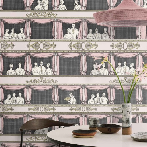 Le papier peint Teatro de la collection Fornasetti Senza Tempo de Cole & Son reflète l'admiration de Piero Fornasetti pour la musique et le théâtre, s'inspirant richement de la Commedia dell'arte italienne pour créer ce design enchanteur.