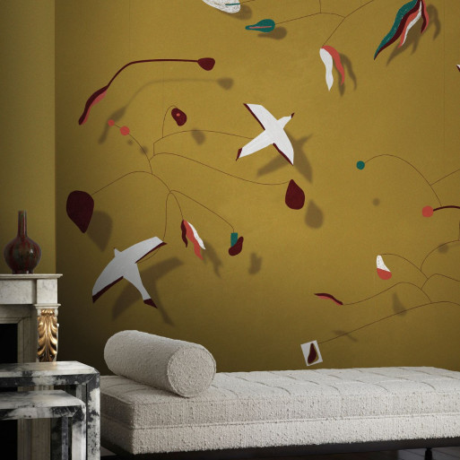 Le papier peint Les Mobiles Panoramique de la collection Grand Angle par Nobilis, s'inspire des célèbres œuvres de Calder pour créer une atmosphère de suspension et de délicatesse.