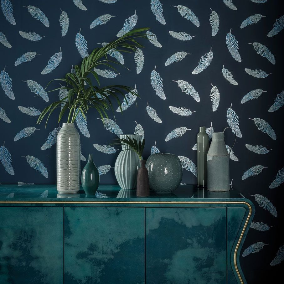Le papier peint Adornado de la collection Deya de chez Osborne & Little présente des plumes étincelantes, semblables à des joyaux, flottant sur un fond contrasté