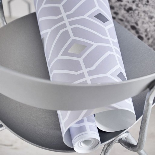 Le papier peint Laterza de la collection Majolica de Designers Guild mêle un treillage classique à une touche moderne, sublimé par des éclats métalliques pour un design raffiné et graphique.