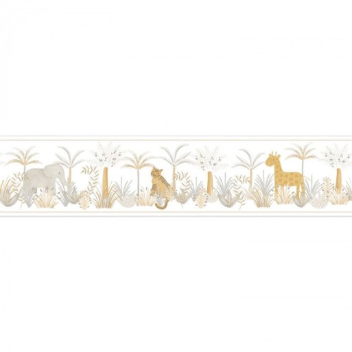 La frise Léon de la collection Rose & Nino de Casadéco , présente des animaux de la jungle dans un style graphique et coloré, idéal pour égayer les chambres d'enfants.